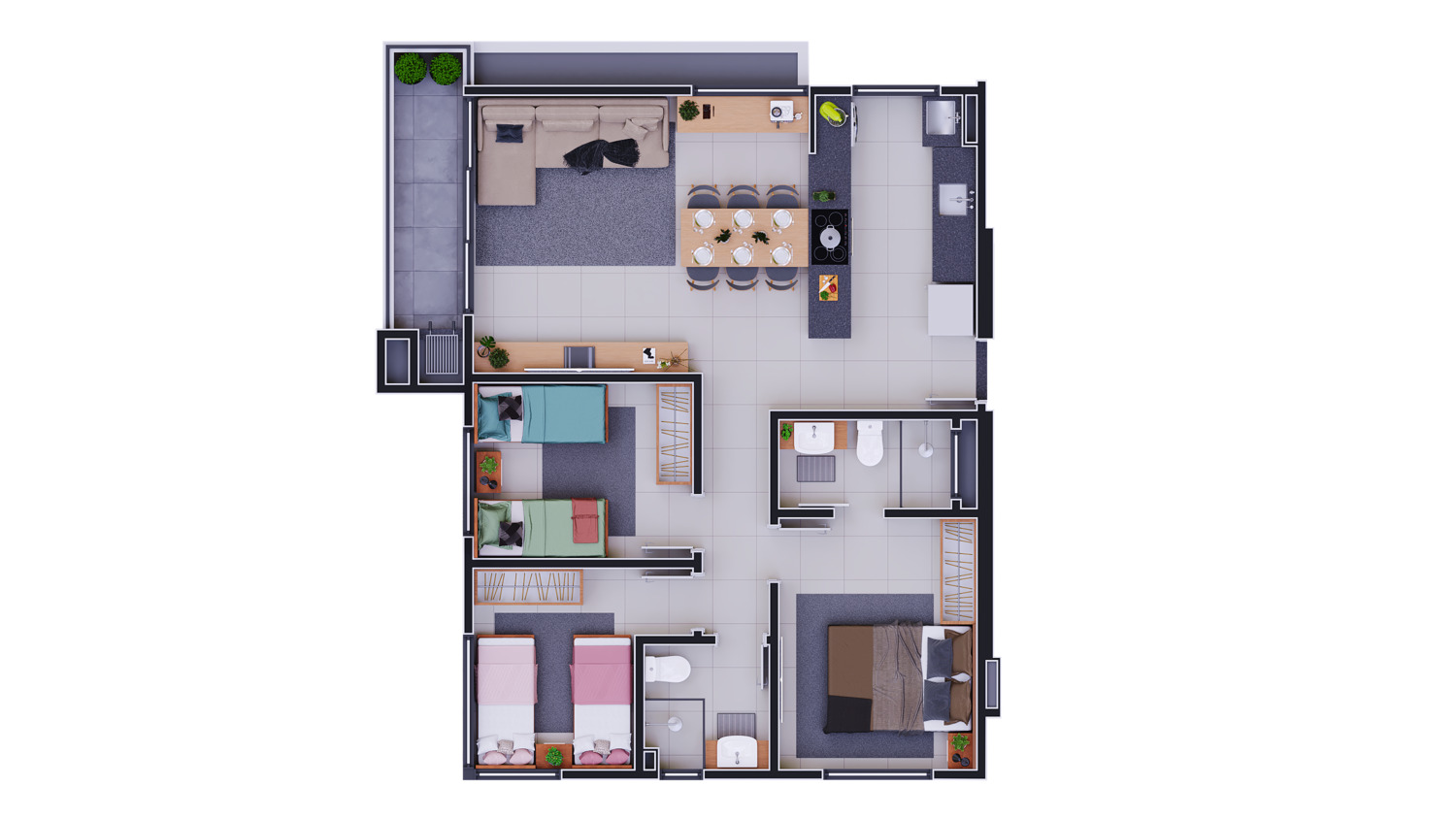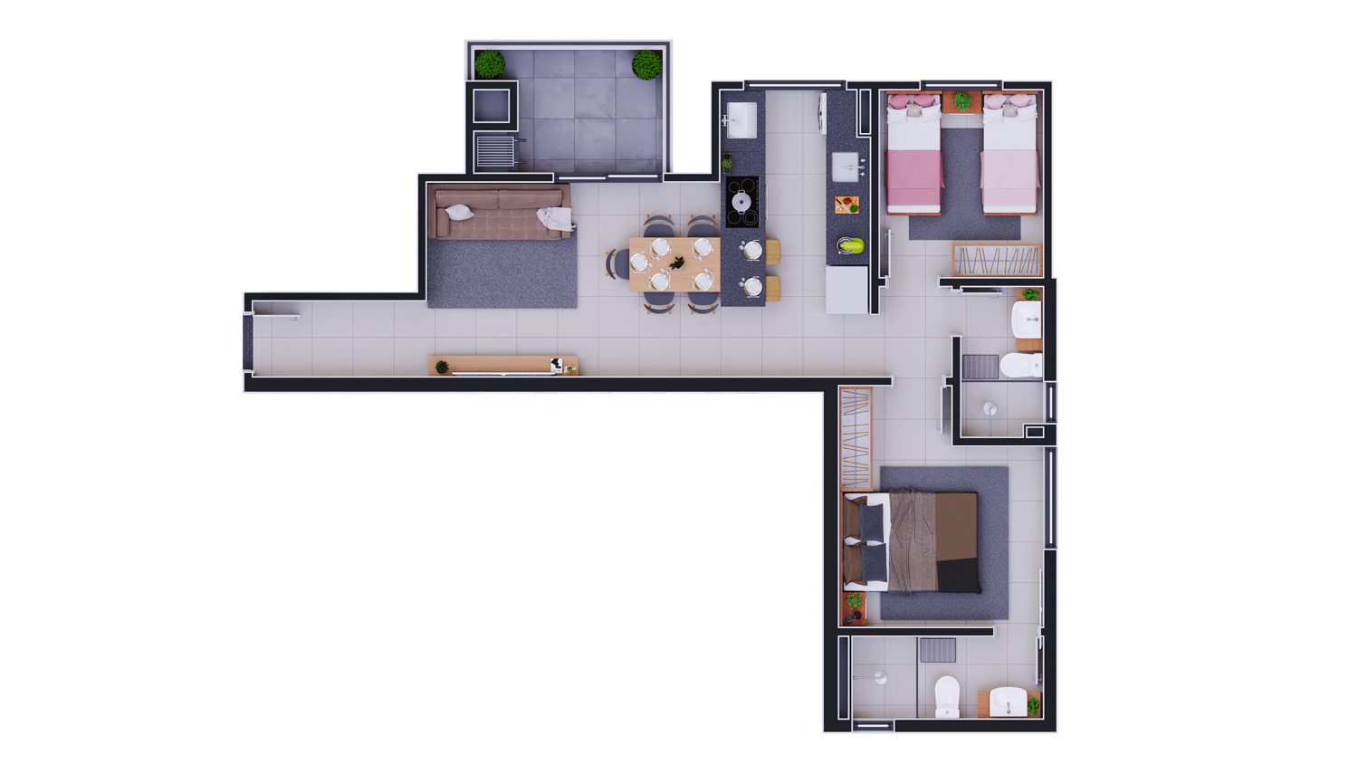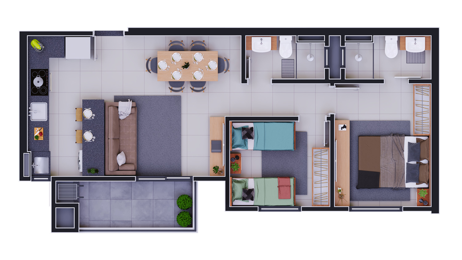 2 apartamentos Garden com 62m², 2 quartos (1 suíte), terraço descoberto com churrasqueira e 2 vagas de garagem.