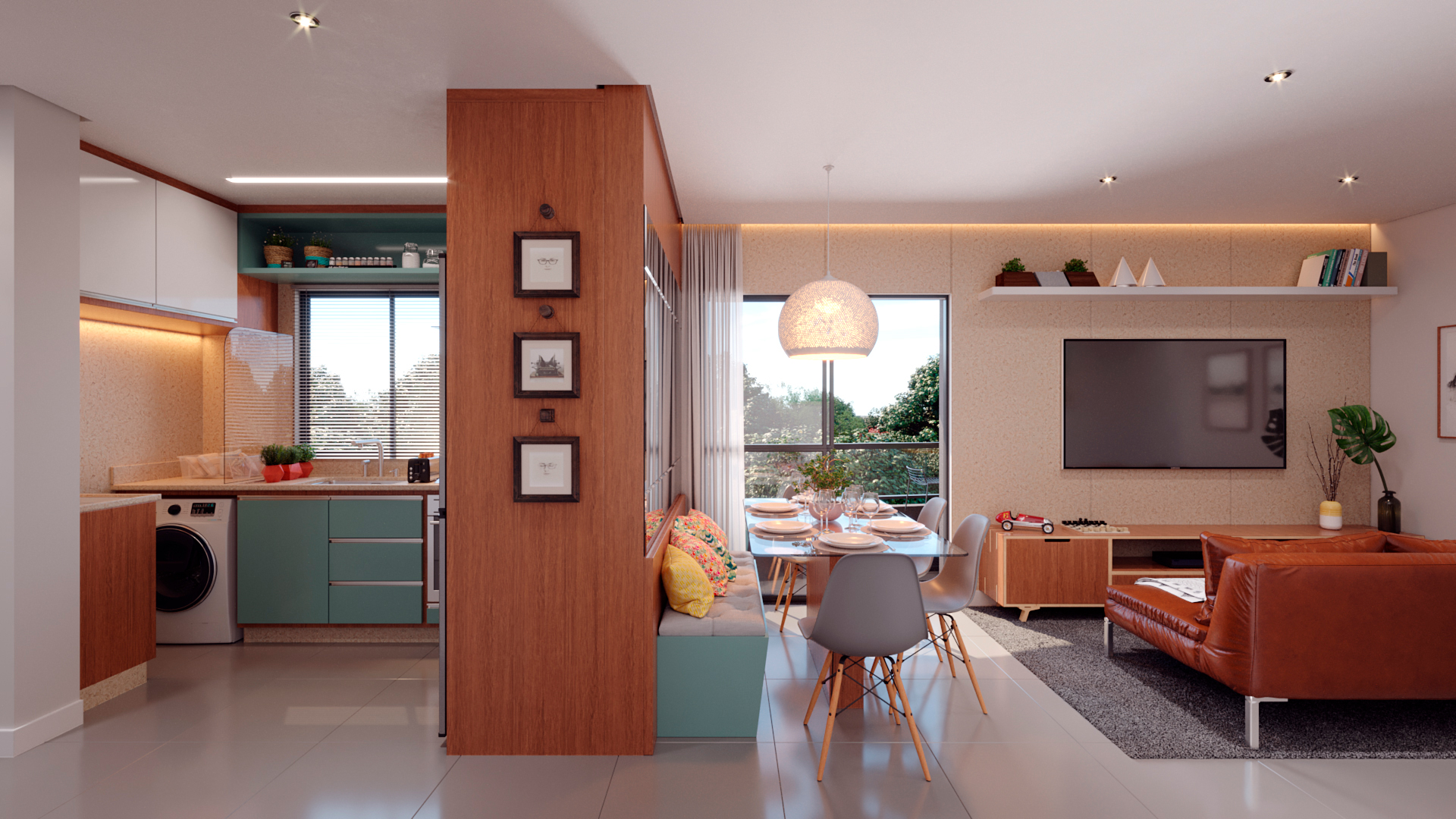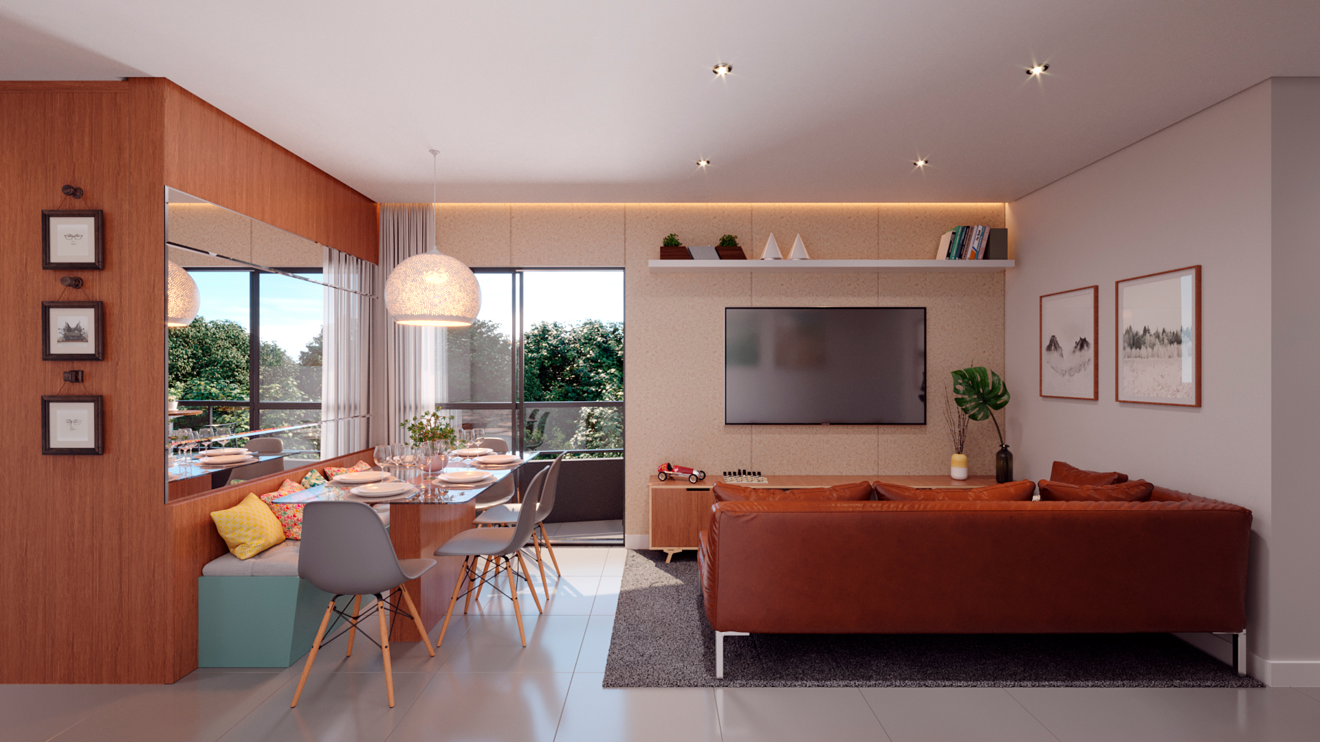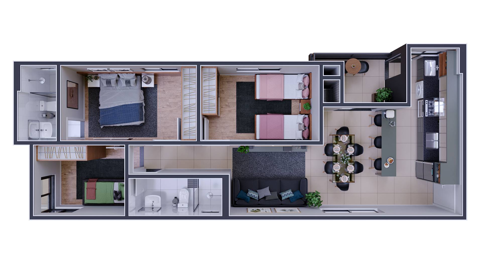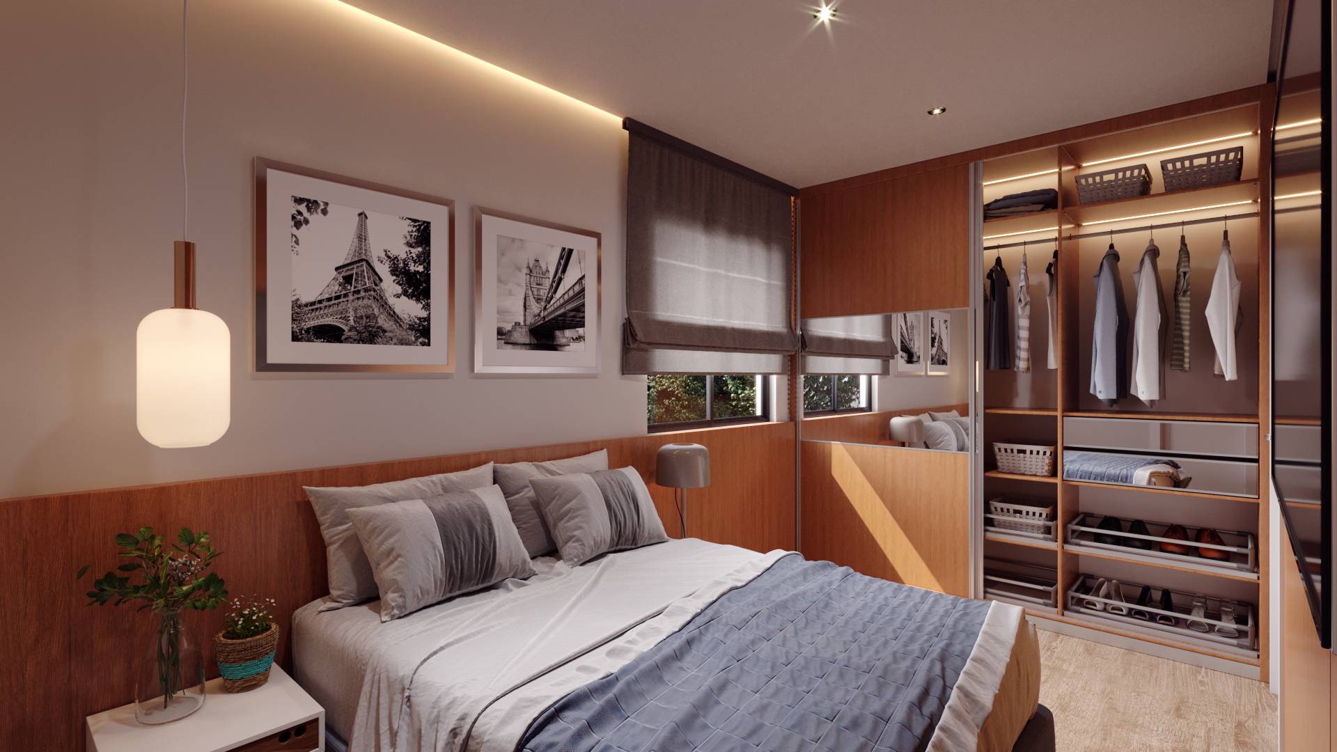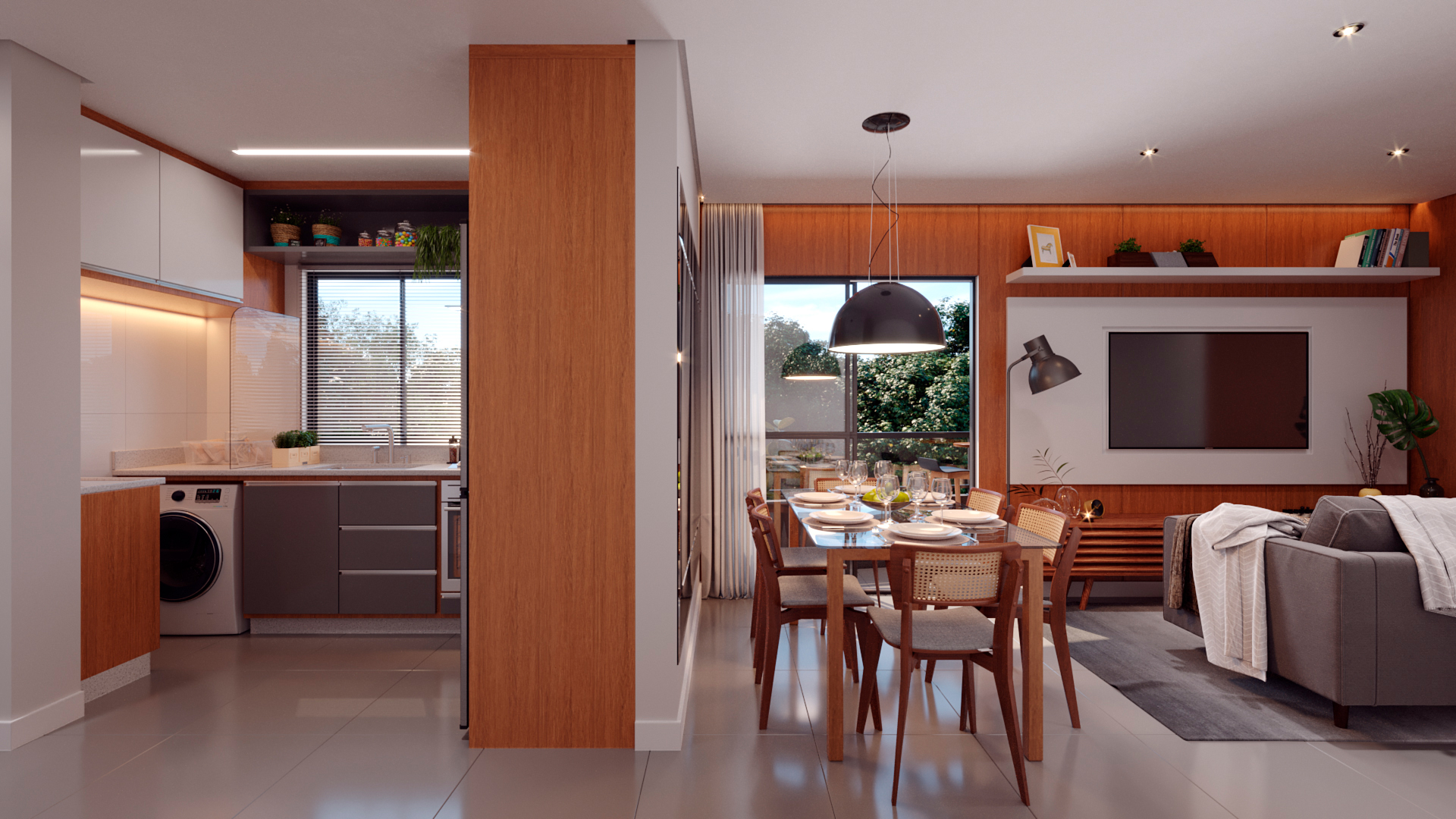 Piso laminado nos quartos e porcelanato nos demais ambientes