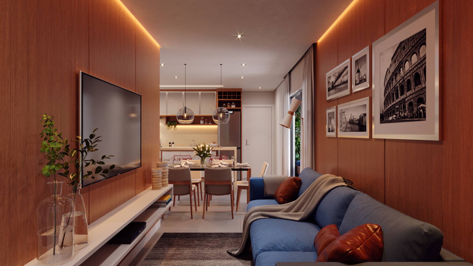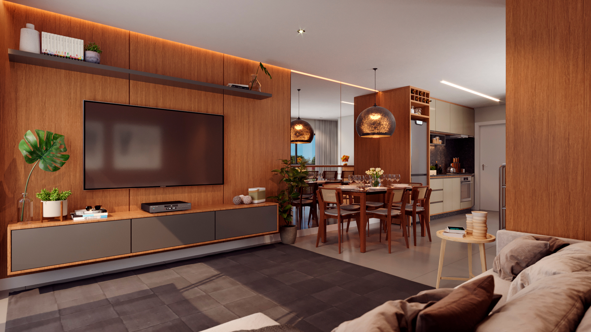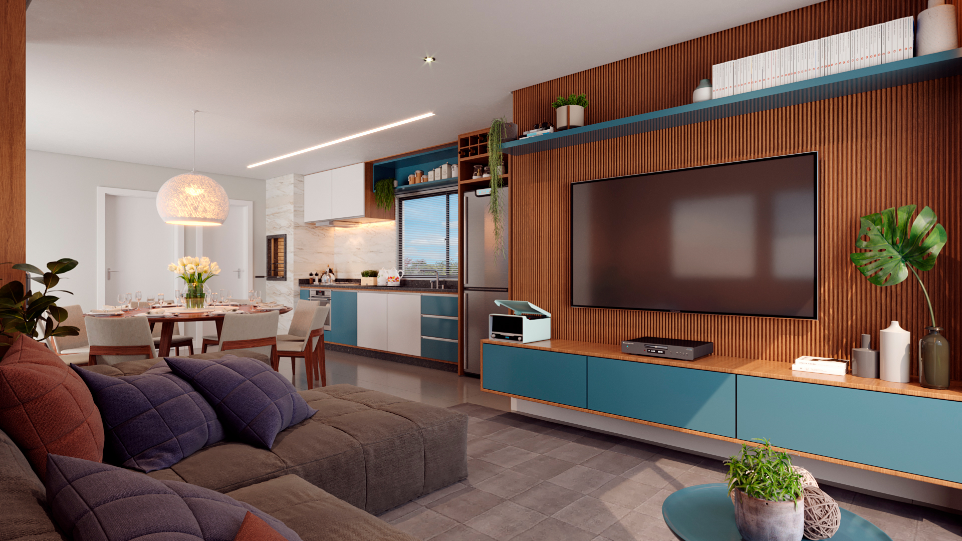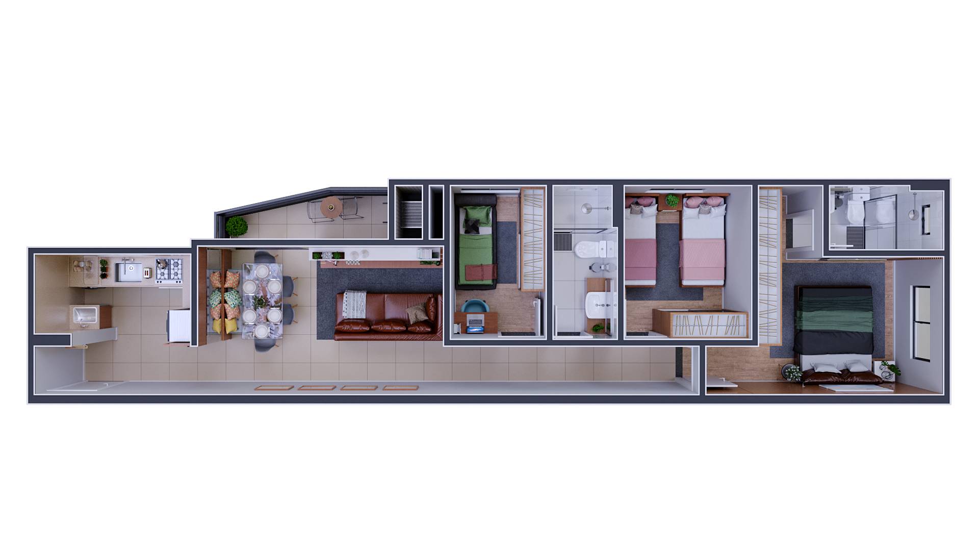 Piso laminado nos quartos e porcelanato nos demais ambientes