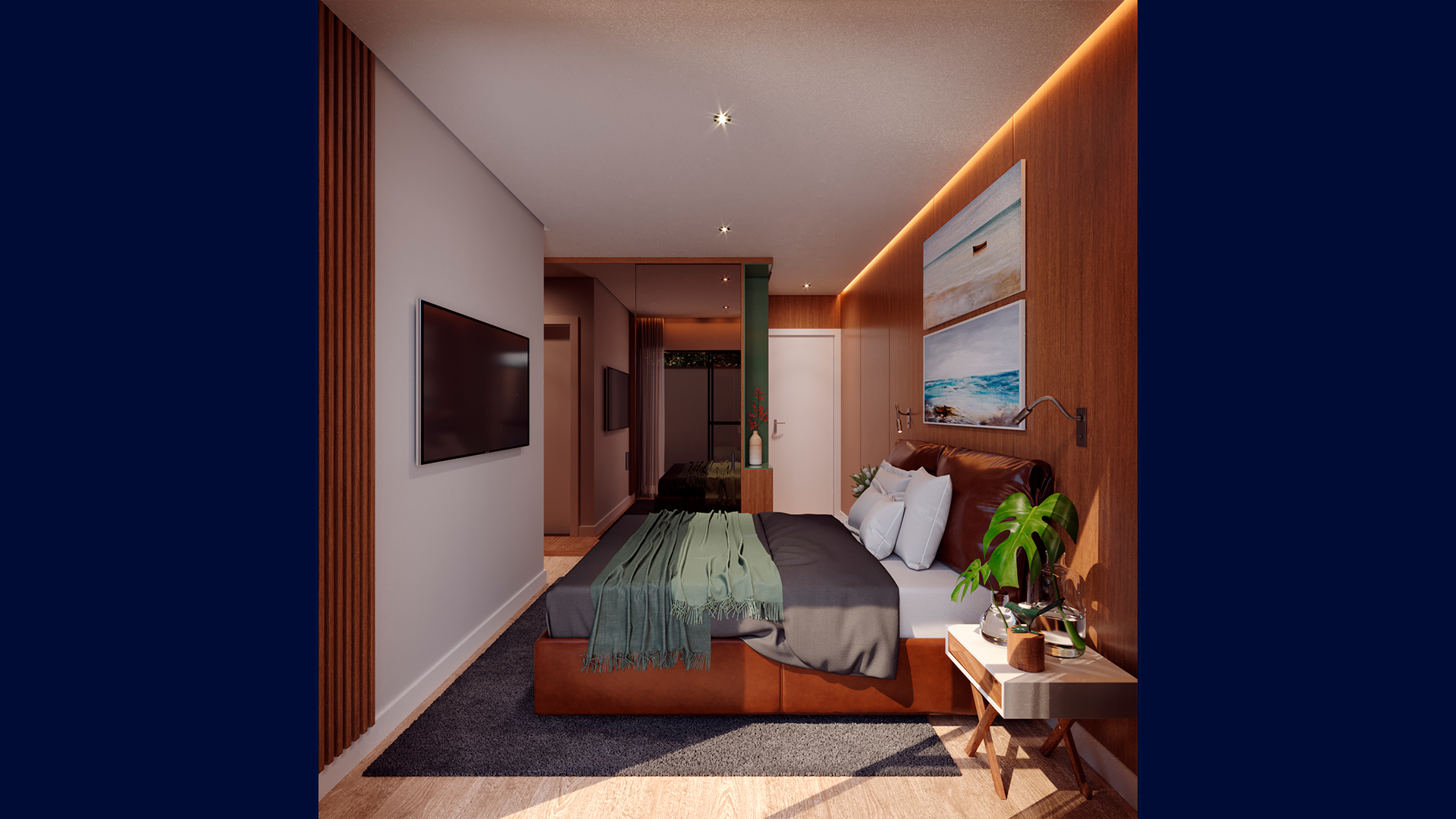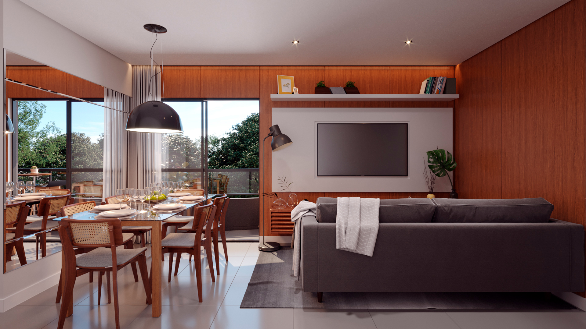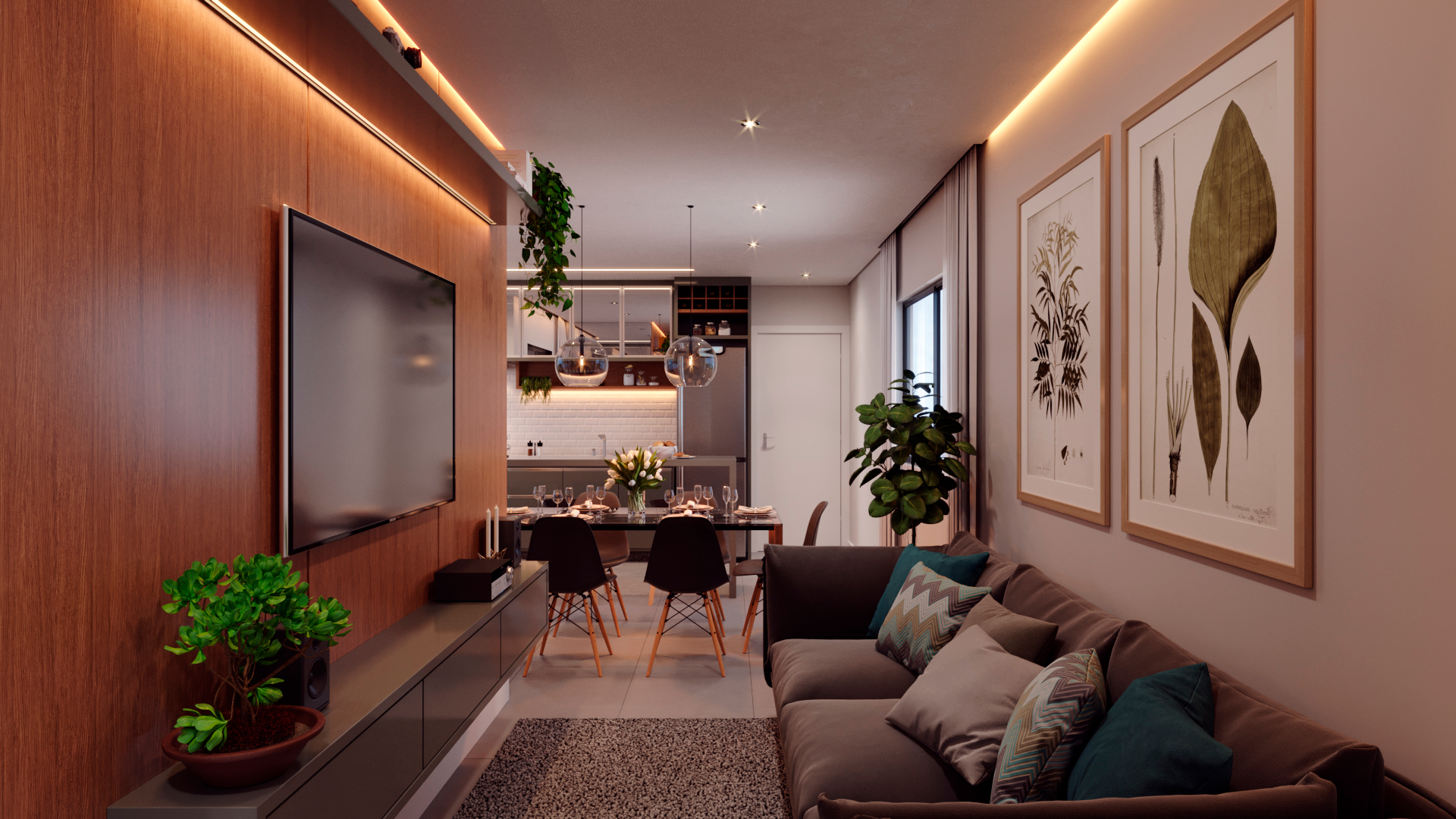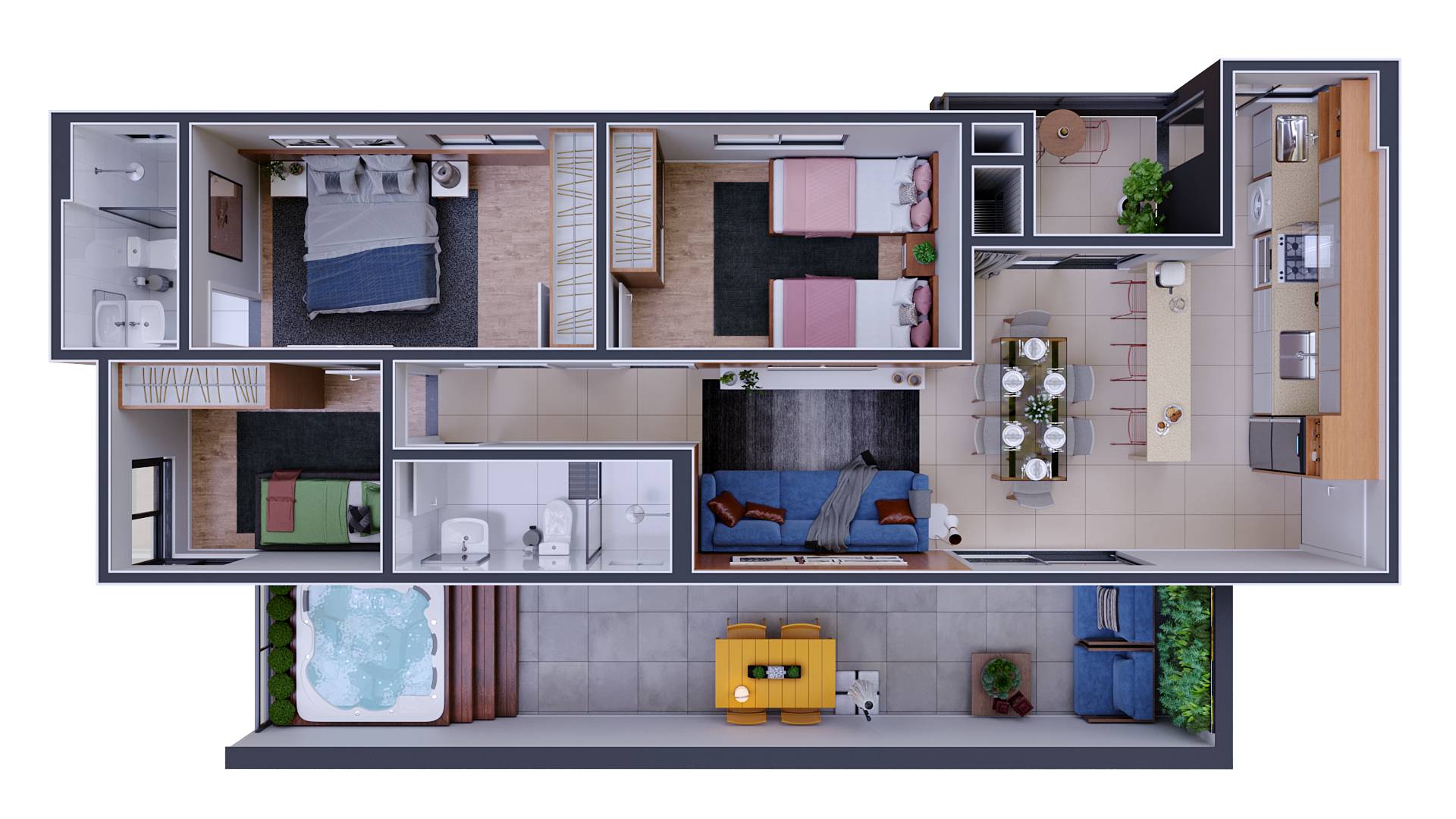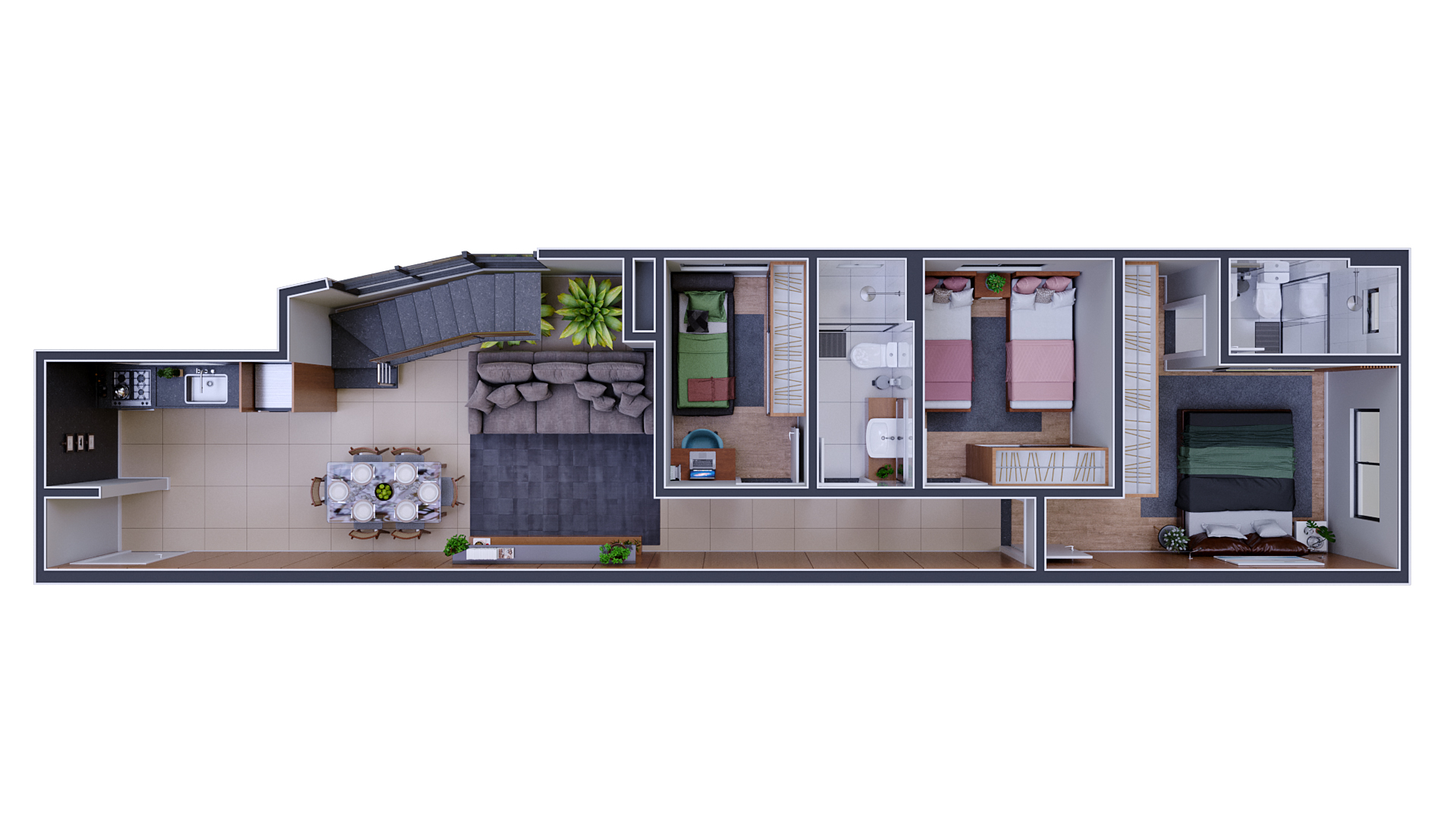 Piso laminado nos quartos e porcelanato nos demais ambientes