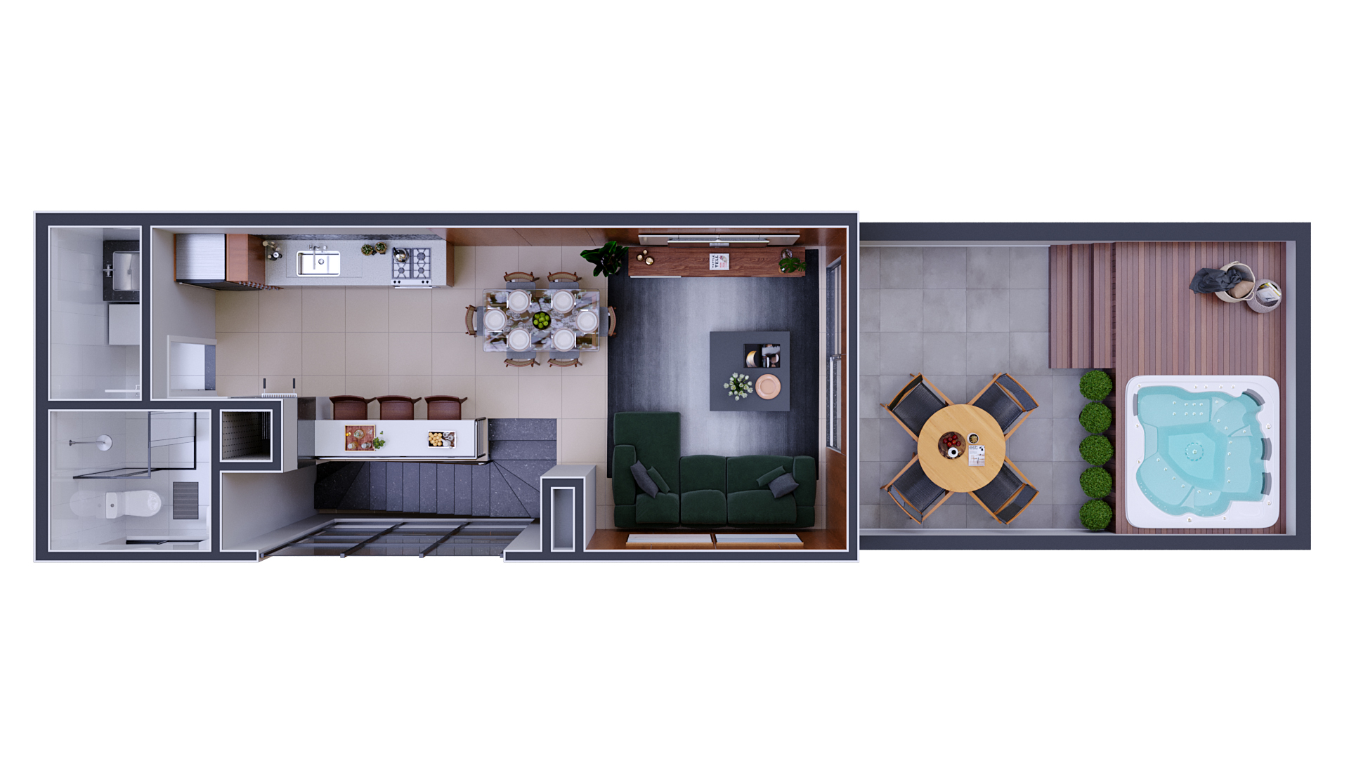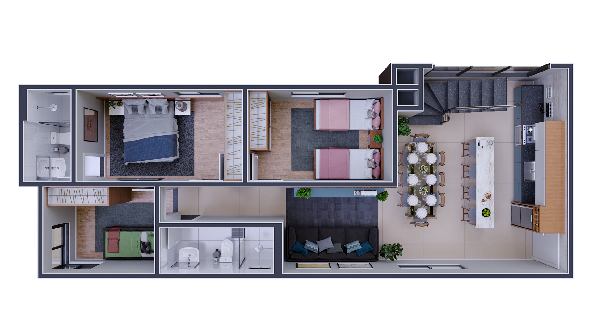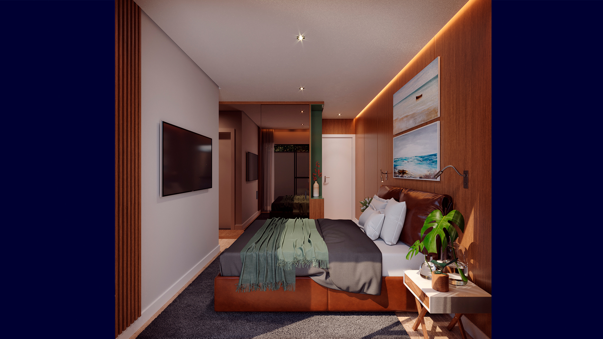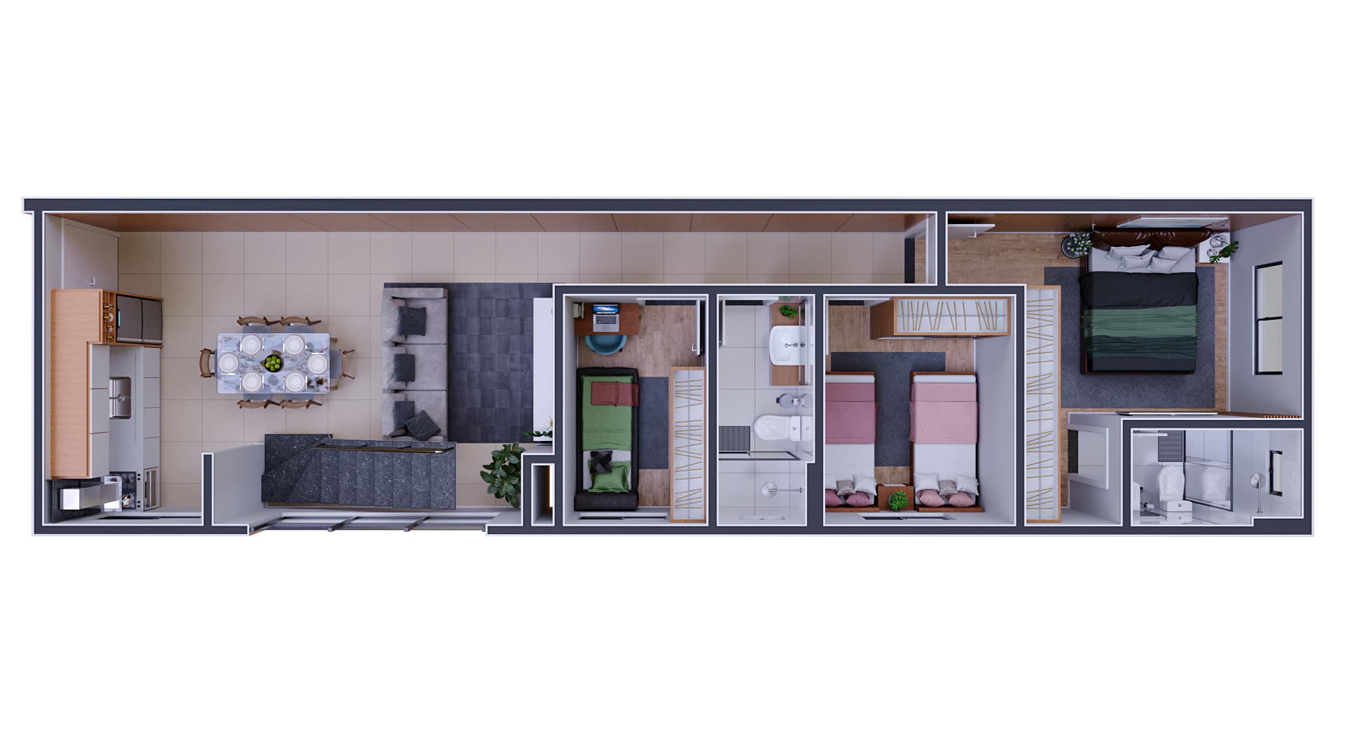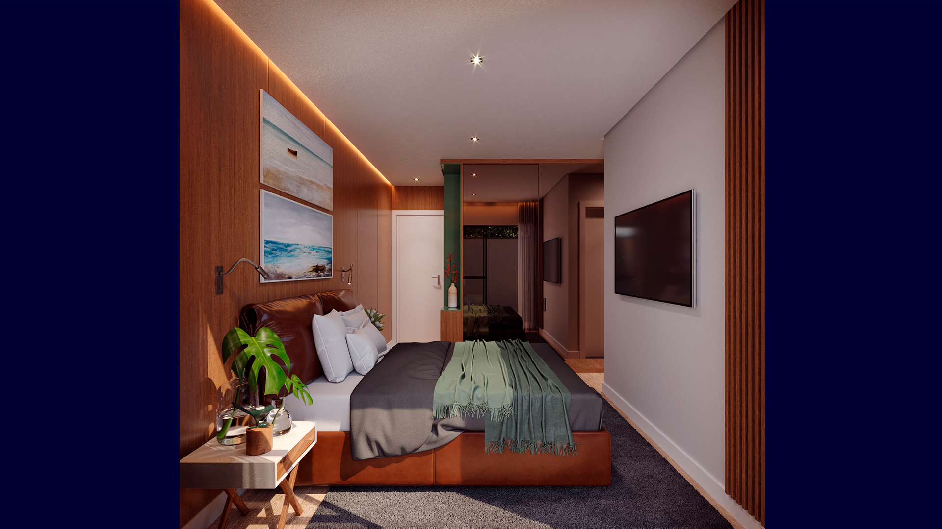 Piso laminado nos quartos e porcelanato nos demais ambientes
